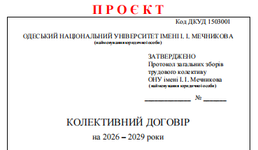 Шановні колеги! Спільна комісія з представників Адміністрації та Профкому завершила формування ПРОЄКТУ КОЛЕКТИВНОГО ДОГОВОРУ, який уже готовий до винесення на конференцію трудового колективу.  Надсилаємо ПРОЄКТ вам для ознайомлення. КД_ПРОЄКТ_2026-2029-1Завантажити У разі наявності рекомендацій або пропозицій просимо надіслати їх на електронну адресу profcom@onu.edu.ua комісія оперативно розгляне всі звернення до конференції.